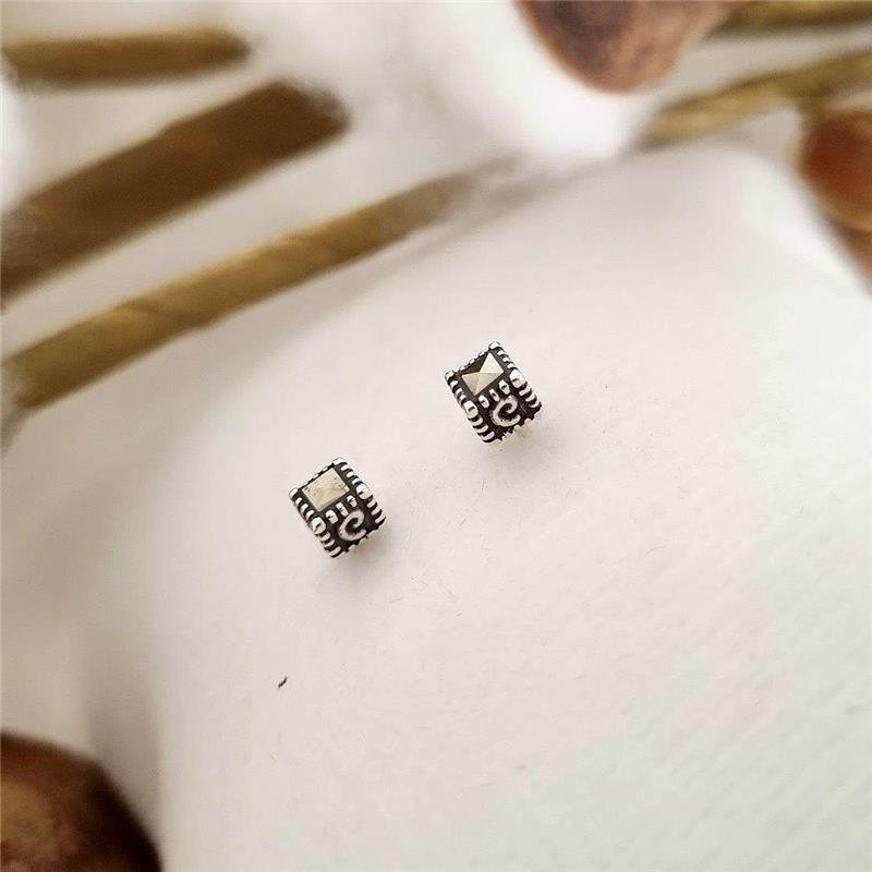 Brinco Prata 925 legítima em bali. Cubinho com face frontal cravejada com pedra marcassita de lapidação quadrada, bordas todas trabalhadas com risquinhos, e quatro faces laterias com desenho de espiral. Fecho tarracha com pino localizado no centro do cubo.Medidas