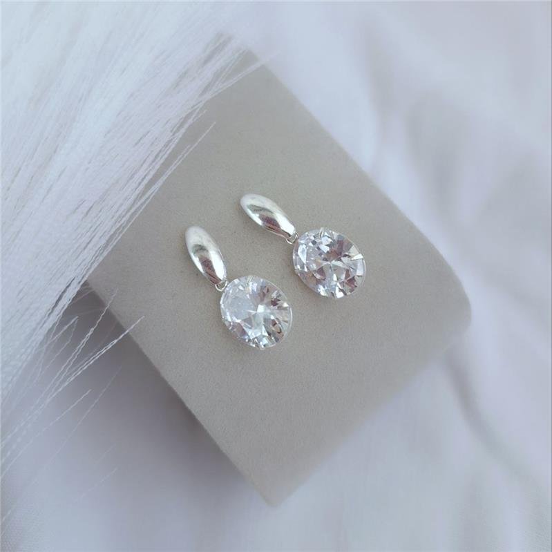 Brinco em Prata 925, com haste abaulada em prata branca e zircônia oval de 9mm pendurada.Pino com tarracha na parte superior.