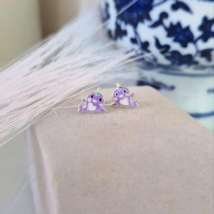 Brinco Prata 925 legítima, narval lilás. O narval, é um tipo de baleia dentada do Ártico, conhecido como o "unicórnio do mar" por causa da sua longa presa espiralada.Deixe a imaginação da sua pequena florescer com este adorável par de brincos. O fecho com tarracha baby garante segurança e conforto para a sua criança. Um par de brincos que traz alegria e estilo para o seu visual infantil.