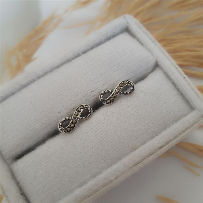 Brinco Prata 925 legítima em Bali. Modelo infinito, coma volta de cima mais larga que a de baixo e cravejado com pedra marcassita. Brinco de tarracha no meio da peça.Medidas: