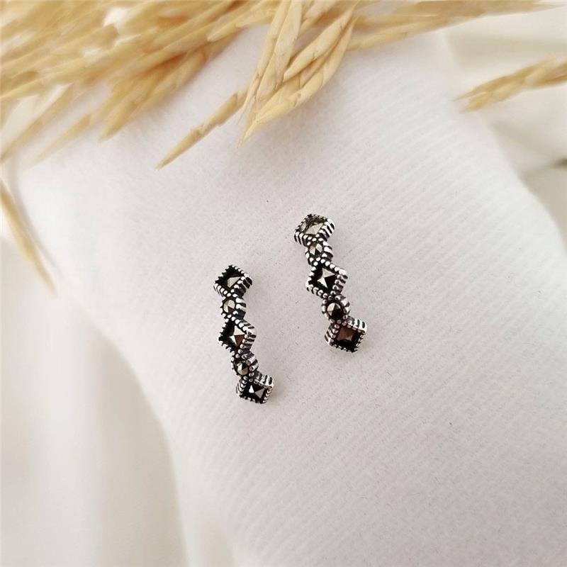 Brinco Prata 925 legítima em bali. Linha com três losangos intercalados por bolinhas com pedra de marcassita no formato nos mesmos formatos, peça abaulada. Fecho tarracha com pino localizado na parte superior da peça.Medidas