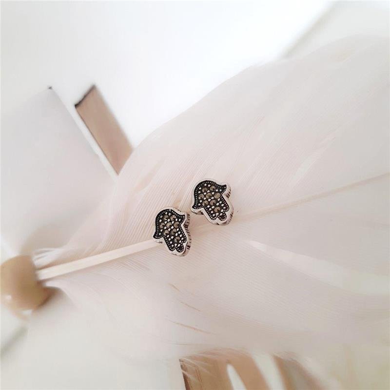 Brinco Prata 925 legítima em Bali. Mão de fátima com as berdas lisas, meio trabalhado com bolinhas e cravejado de pedra marcassita. Pino com tarracha localizado na parte superior do brinco.Medidas