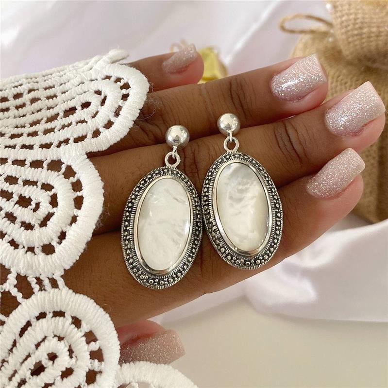 Brinco Prata 925 Legitima em Bali. Base meia bolinha, pendurado oval com pedra natural no centro e em volta trabalhado com detalhes de bolinhas. Pino localizado no centro da bolinha.Medidas: