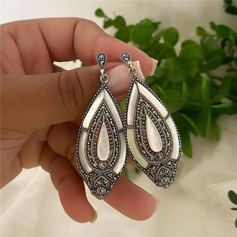 Brinco Prata 925 Legitima em Bali. Base gota invertida trabalhada com detalhe de listras e com pedras marcassita. Pendurado gota contorno trabalhado de bolinhas em seu interior três pedra naturais madreperola, em seguida cravejada com pedra marcassita e uma pedra madreperola no centro. Sua ponta é cravejada na pedra marcassita e trabalhada com detalhes de listras. Pino localizado na parte superior atras da base de gota.Medidas:
