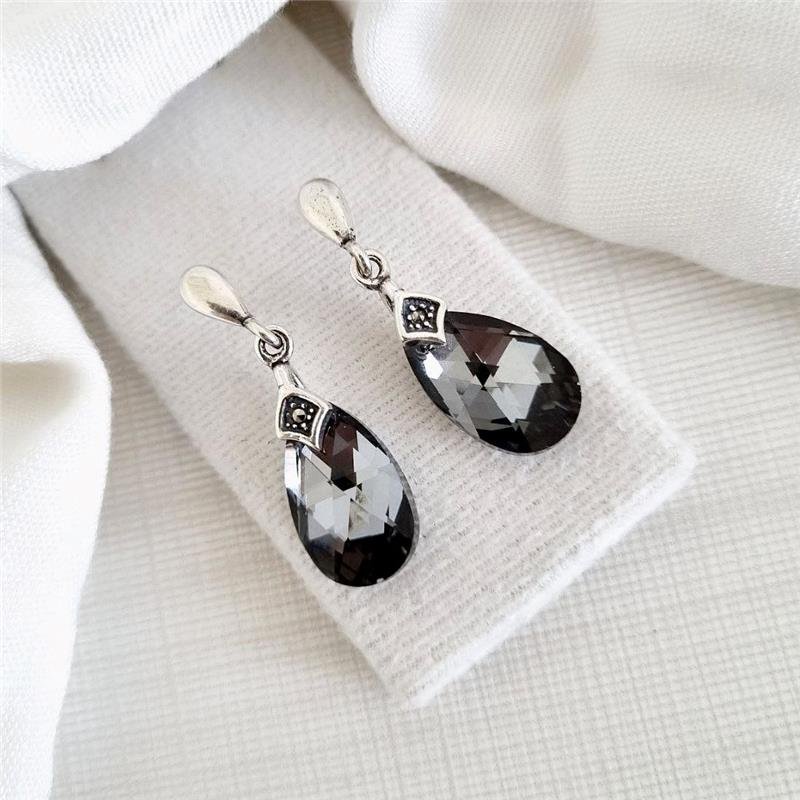 Brinco Prata 925 legítima em bali. Base de gota invertida lisa, pedra em Cristal Preta em formato gota e base da pedra de losango cravejado com pedra marcassita. Fecho tarracha.Medidas