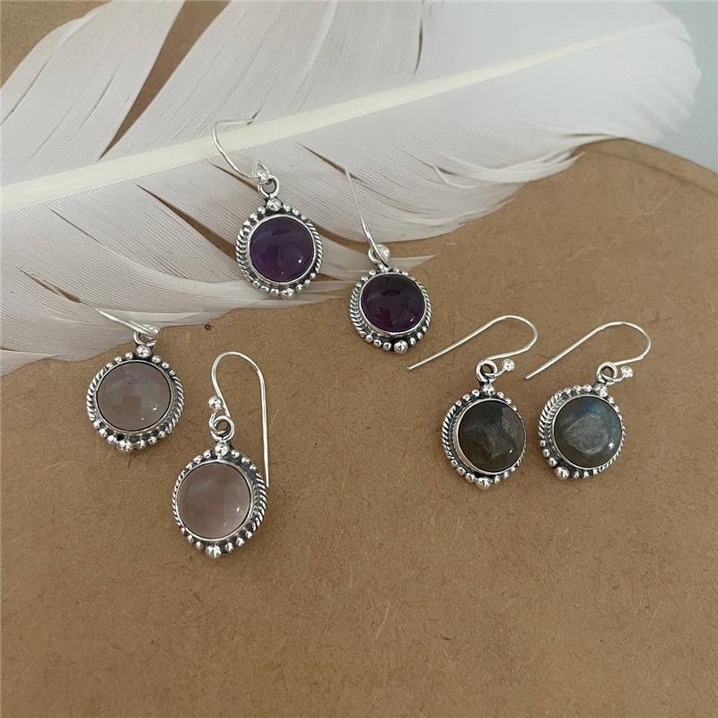 Brinco Prata 925 legítima em bali. Pendurado com pedra natural redonda nas variaçõea Ametista, Labradorita e Quartzo Rosa, com borda trabalhada em detalhes torcidos e com bolinhas de tamnhos diferentes. Brinco pendurado estilo anzol.Medidas: