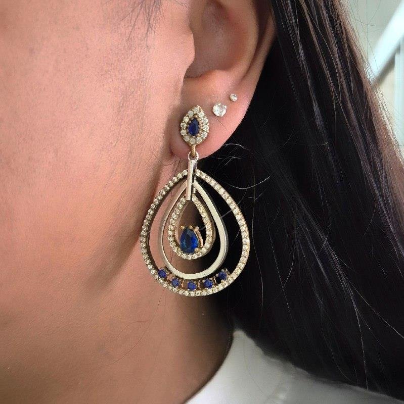 Brinco Prata Turca pendurado Gota cravejada com zirconias. Variação de zirconia vermelha e azul. Brinco com Pino e Tarracha Grande de sustentação.