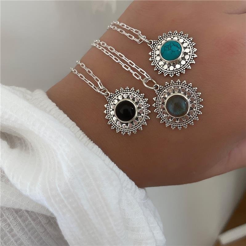 Colar prata bali corrente cartier e pingente redondo com pedra natural trabalhado com detalhes em bolinha e circulares - Labradorita, Onix e Turqueza. Fecho boia. Confeccionado em Prata 925.Medidas: