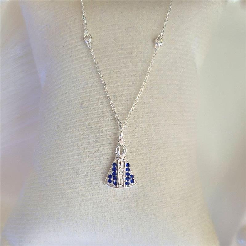 Colar Prata 925 Nossa Senhora Aparecida Cravejada Azul Com Ponto Luz. Fecho mosquete e extensor.Medidas: