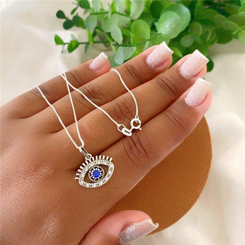 Colar Prata 925 Legitima em Bali. Corrente veneziana, pingente olho cravejado na pedra zircônia e com uma pedra zircônia azul no centro, com trabalhados em bali. Fecho boia.Medidas: