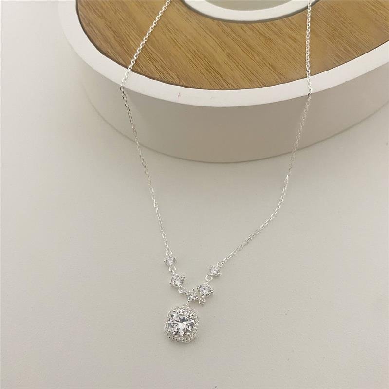 Colar Prata 925 legítima com zircônia 6mm, cravejada em volta com mini zircônias, em formato quadrado, pendurada em outras 5 zircônias, que são parte da corrente do colar.Medidas: