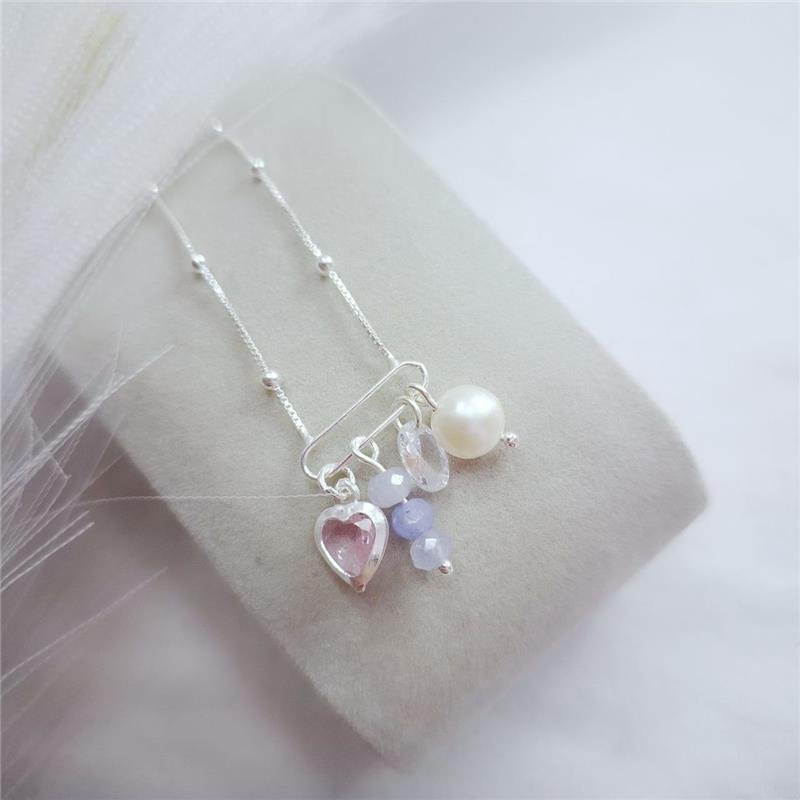 Colar Prata 925 em corrente veneziana com bolinhas e pingente com coração de zircônia rosa claro, bolinhas lilás, zircônia oval e pérola orgânica. Fecho bóia.Medidas