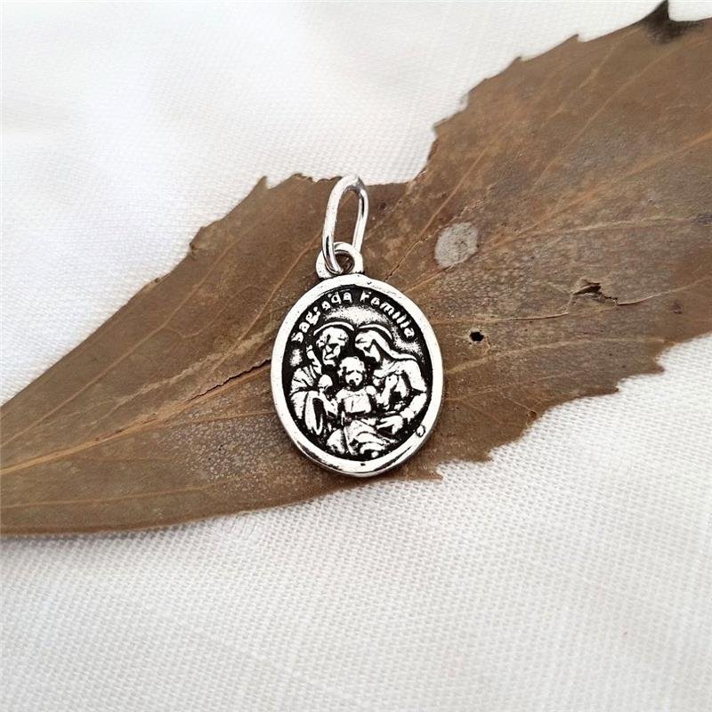 Pingente Prata 925 legítima em bali. Medalha religiosa com imagem em alto relevo representando a Sagrada Família na face frontal e na parte de trás, a representação de seus três corações, acompanhados pela inscrição "Minha família, vossa é!", transmitindo uma profunda devoção à Sagrada Família e à fé cristã. Esta medalha é uma expressão tocante de amor e fé na unidade familiar sob a proteção divina.Medidas