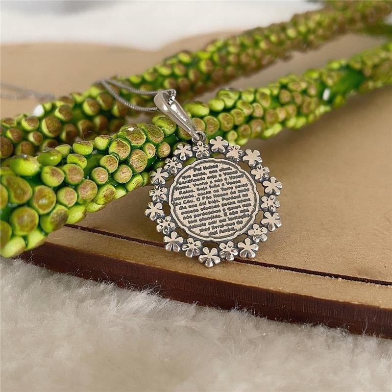 Pingente medalha com oração pai nosso na prata bali com flores em volta. Confeccionado em Prata 925.Medidas: