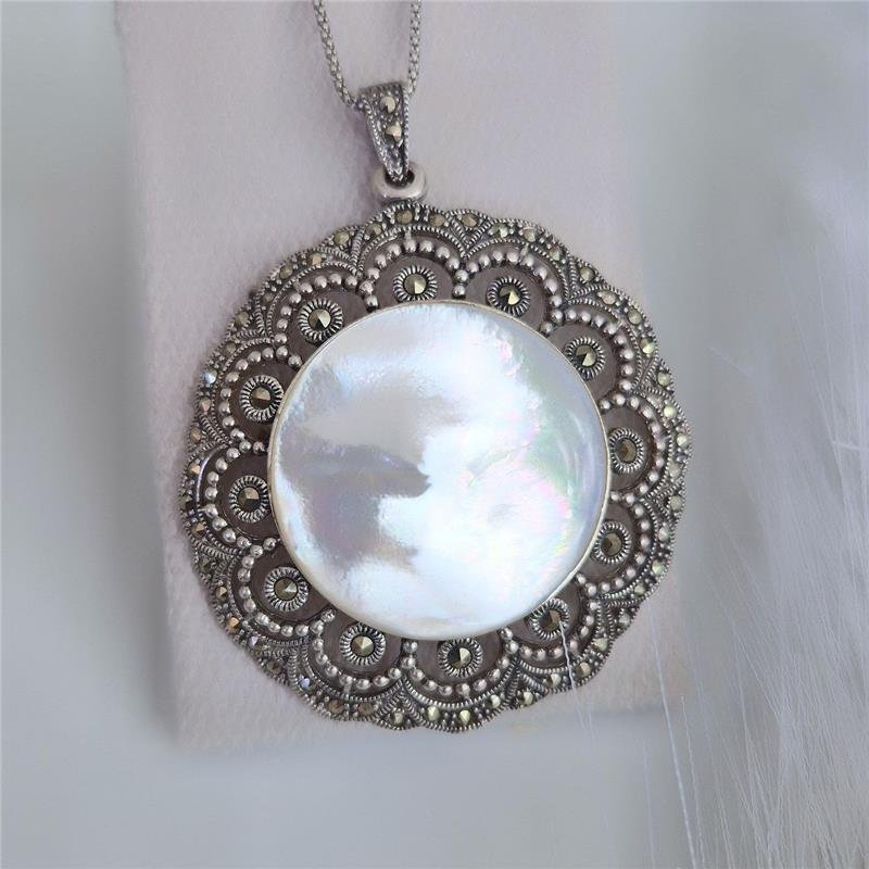 Pingente Prata 925 em bali. Mandala em formato de flor cravejada com marcassitas e com madre perola no meio.Medidas: