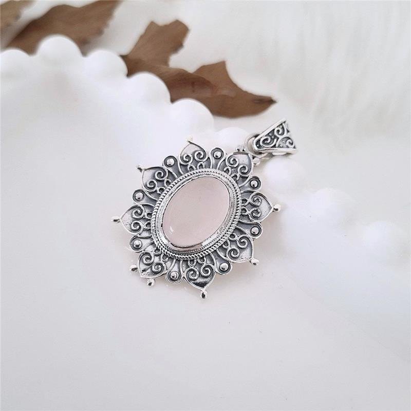 Pingente Prata 925 legítima em bali. Miolo oval em pedra natural Quartzo Rosa com laterais trabalhadas formando pétalas. Base larga em V e trabalhada.Medidas