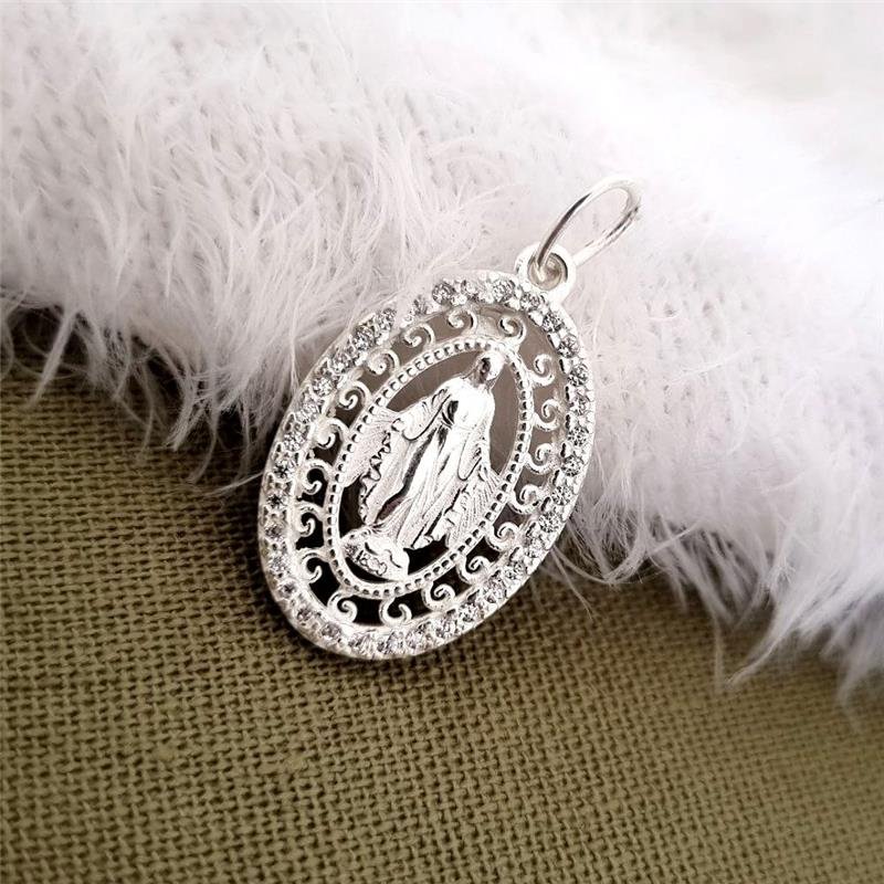 Pingente Prata 925 legítima. Medalha Nossa Senhora das Graças, oval, imagem trabalhada no centro, fundo vazado, lateral com bolinhas, arabescos e extremidades cravejadas com pedra zircônia. Base fina oval.Medidas