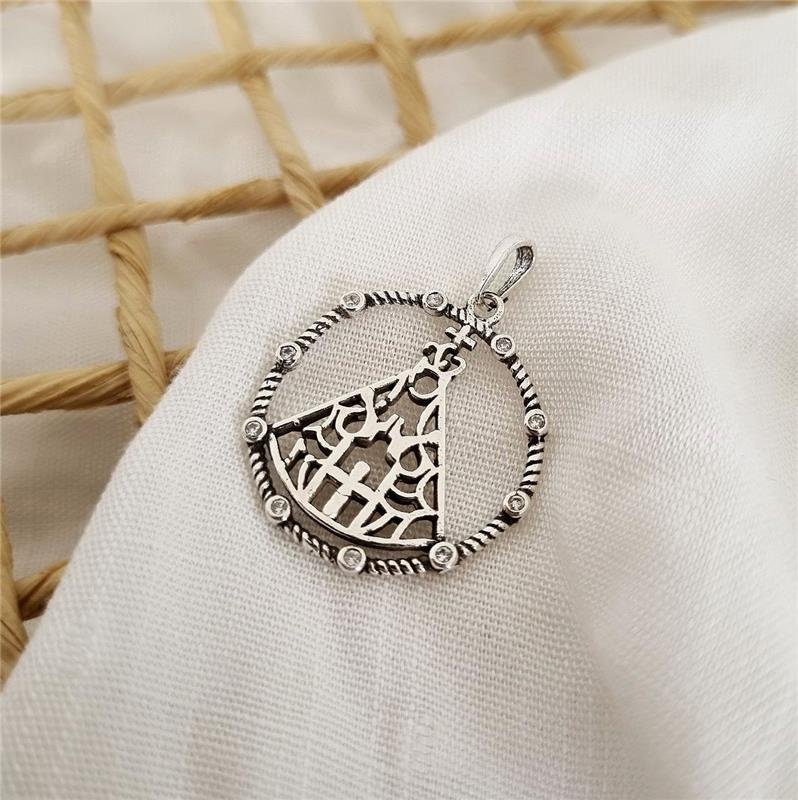 Pingente Prata 925 legítima. Círculo trabalhado estilo corda, com algumas bolinhas cravejadas em pedra zircônia, centro vazado com imagem de Nossa Senhora Aparecida. Base fina em v.Medidas