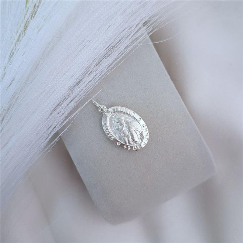 Pingente Prata 925. Medalha imagem Santo Antonio com escrita: * SANTO ANTÔNIO * 13 DE JUNHO *. Cruz em relevo atras. Argola oval.Medidas: