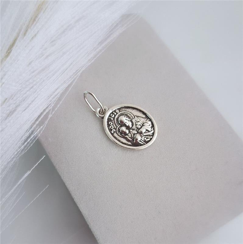 Pingente Prata 925 legítima em bali. Medalha Religiosa de Santo, 1,4 cm com estampa de São José com menino Jesus em alto relevo, borda lisa, parte oposta com frase "Rogai por Nós" e uma rosa em baixo relevo.Medidas