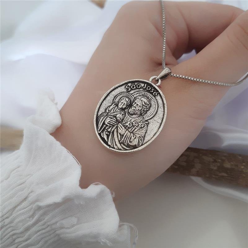 Pingente Prata 925 legítima em bali. Medalha Religiosa de Santo, 3 cm com estampa de São José com menino Jesus em alto relevo, borda lisa, parte oposta com frase "Rogai por Nós" e uma rosa em baixo relevo e fundo texturizado.Medidas