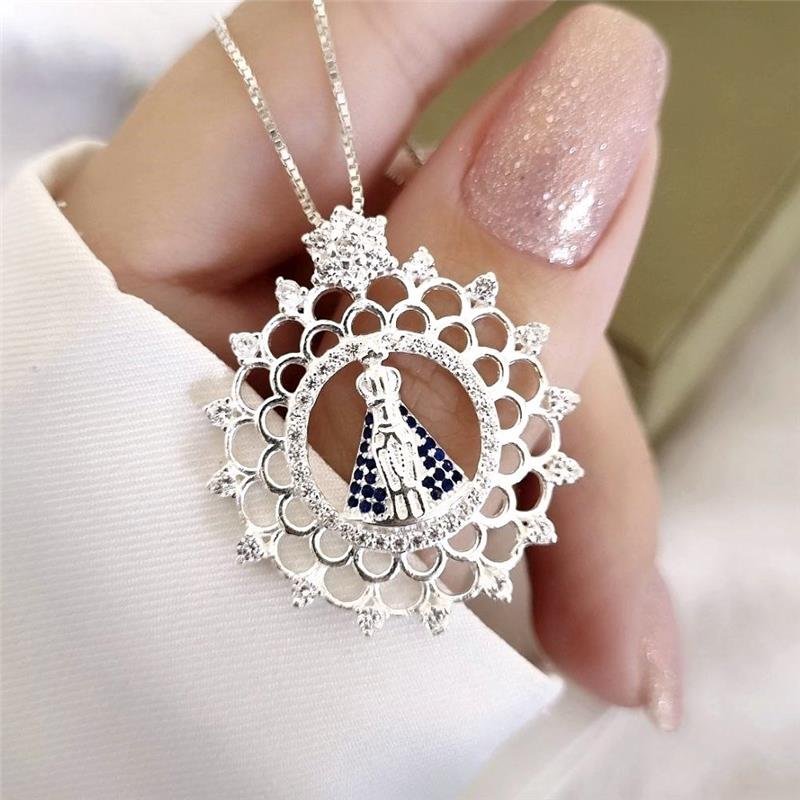 Pingente Prata 925 legítima. Pingente redondo com Nossa Senhora Aparecida cravejada com pedra zircônia azul, fundo vazado, lateral cravejado em pedra zircônia, com babados redondos e pontas cravejadas e topo com flor, tudo em pedra zircônia. Base atrás da flor de zircônia.Medidas