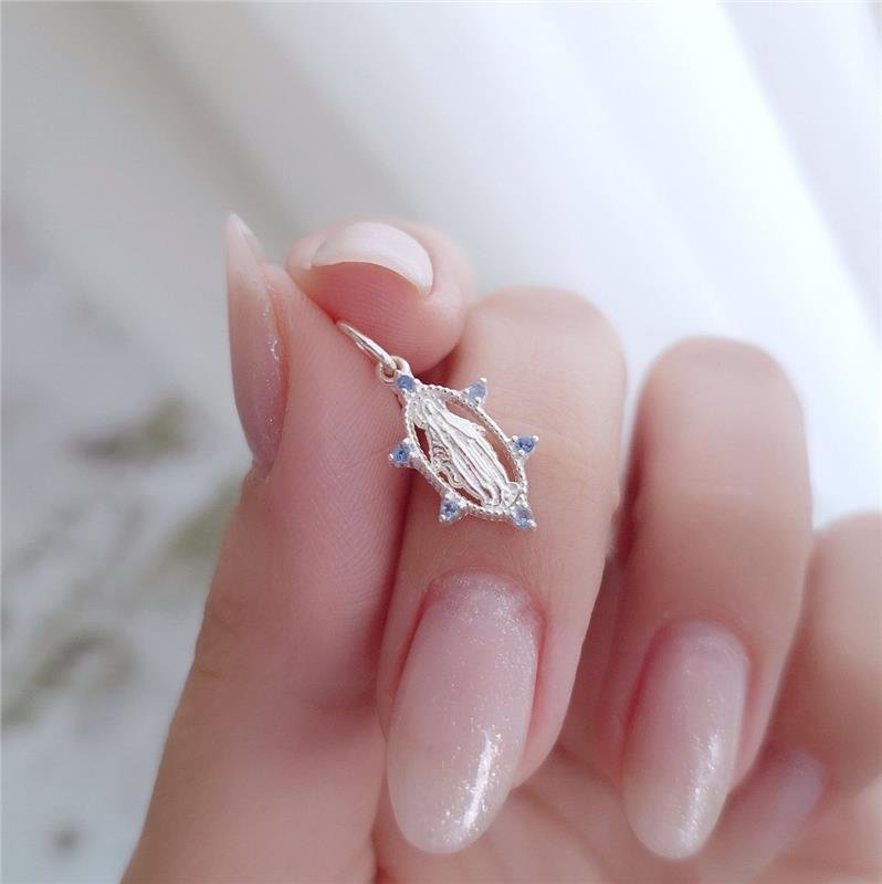 Prata 925 Legítima. Pingente Oval Com Nossa Senhora Das Graças No Centro Com 6 Zirconias Azuis Em Volta.Medidas: