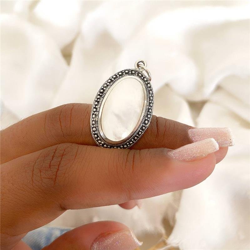 Pingente Prata 925 Legitima em Bali. Oval com pedra natural no centro e em volta trabalhado com detalhes de bolinhas. Pino localizado no centro da bolinha.Medidas:
