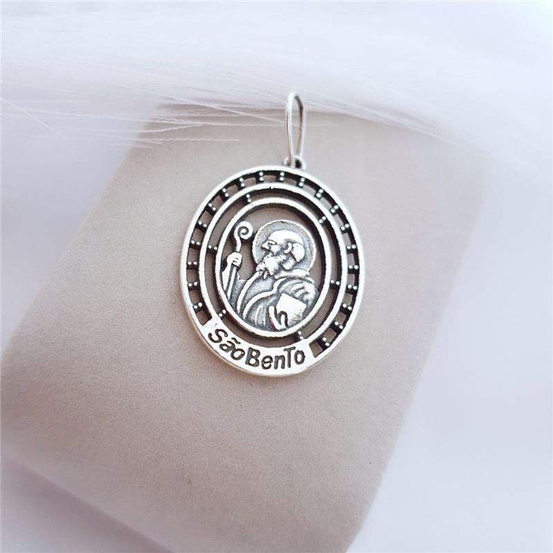 Pingente prata 925 bali São Bento, formato medalha.