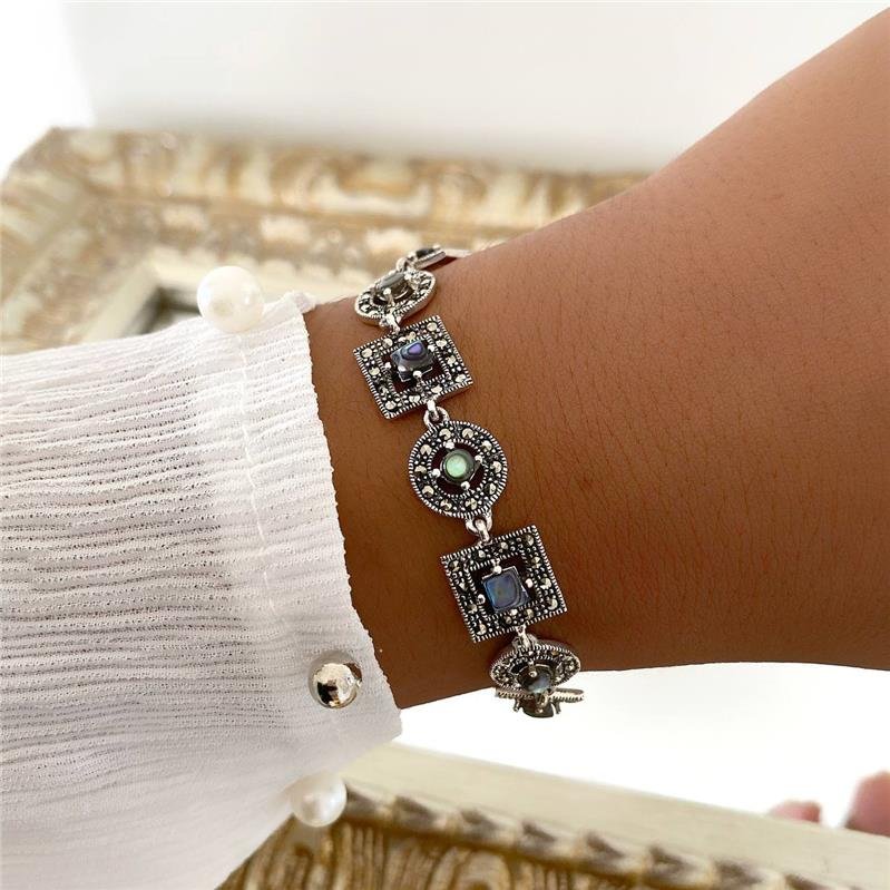 Pulseira Prata 925 Legitima em bali. Circulo intercalado com quadrado no centro de cada figura tem uma pedra natural e em volta é cravejada com pedra marcassita. Fecho click.Medidas: