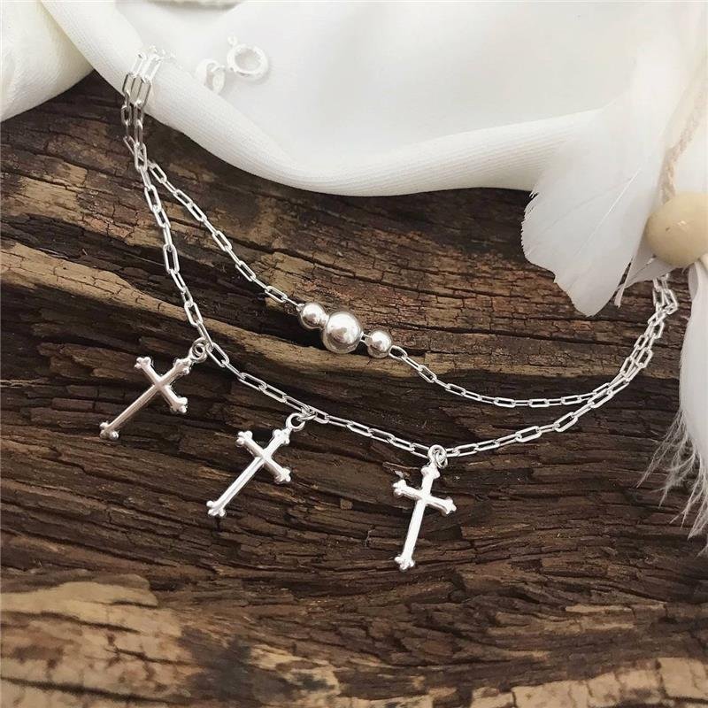 Pulseira Prata 925 legítima. Cordão duplo de elos retangulares, cordões com tamanhos diferentes, o mais curto com três bolinhas, uma maior no meio, e duas menores ao lado e cordão de baixo um pouco mais comprido e com três pingentes de cruz dos mesmos tamanho, abauladas, lisas, com as pontas moldas em três pontinhas arredondadas. Fecho boia.Medidas