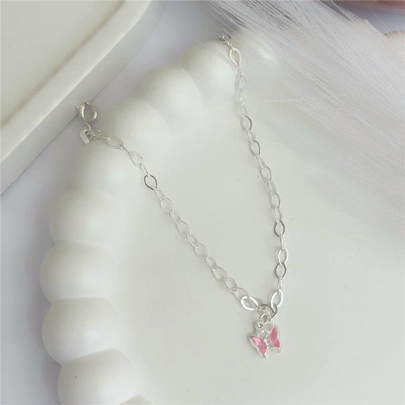 Pulseira em prata 925 em elos, com pingente de borboleta com zircônia rosa.