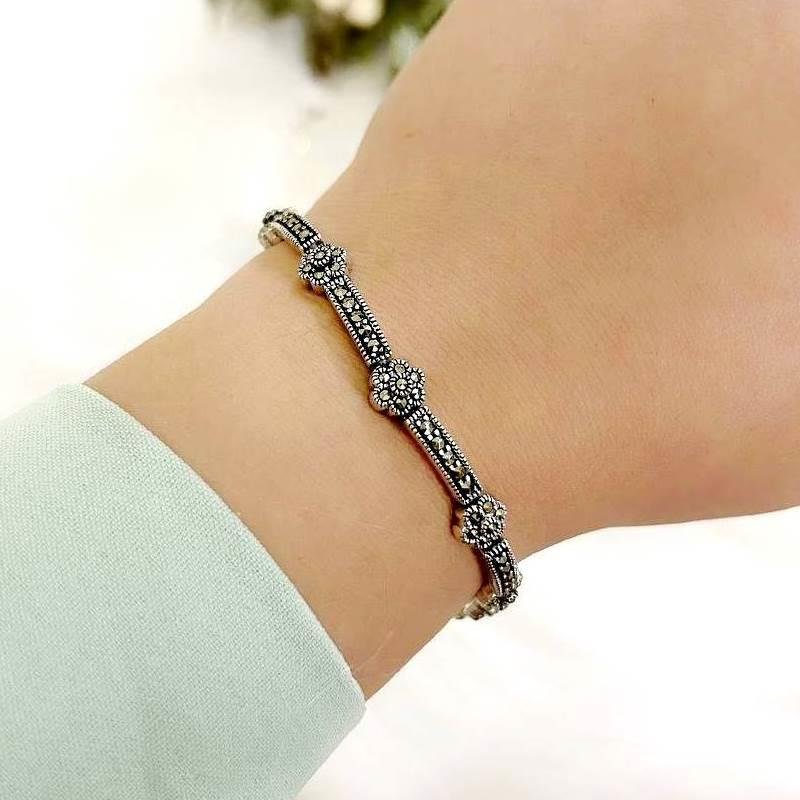 Pulseira Prata 925 legítima em bali. Pulseira com Hastes e flores intercaladas cravejadas com marcassita.Medidas