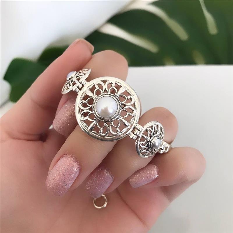 Pulseira Prata 925 legítima em bali. Círculo central maior e um menor de cada lado, mandala com desenhos estilo flor e meia pérola no centro, cordão trançado. Fecho gancho com extensor para regulagem.Medidas