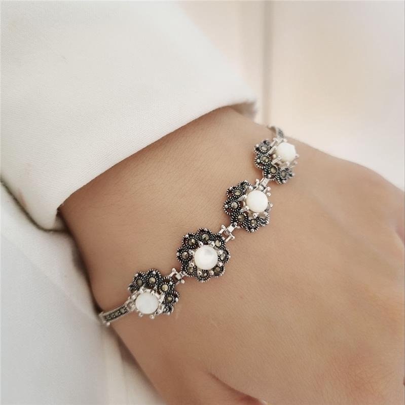 Pulseira Prata 925 legítima em bali. Quatro flores no centro com pétalas vazadas e cravejadas com marcassitas, miolo com madre pérola redonda, laterias da pulseiras com vários filetes retangulares cravejados com pedra marcassita. Fecho click.Medidas