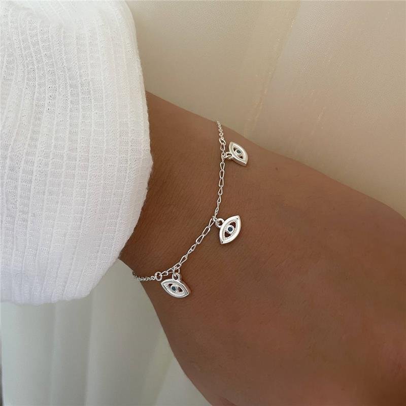 Pulseira prata branca regulável com 3 olhos gregos pendurados vazados. Confeccionado em Prata 925.Medidas: