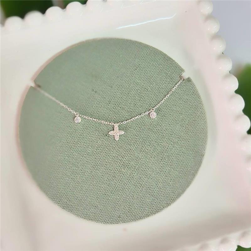 Tornozeleira Prata 925 Florzinha 4 Pétalas Cravejada 2 Pontos Luz. Fecho mosquete com extensor.Medidas:
