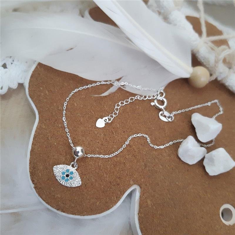 Tornozeleira Prata 925 legítima. Elos com olho grego cravejado de zircônia pendurado 23 cm + 3,5 cm extensor. Fecho boia.Medidas:
