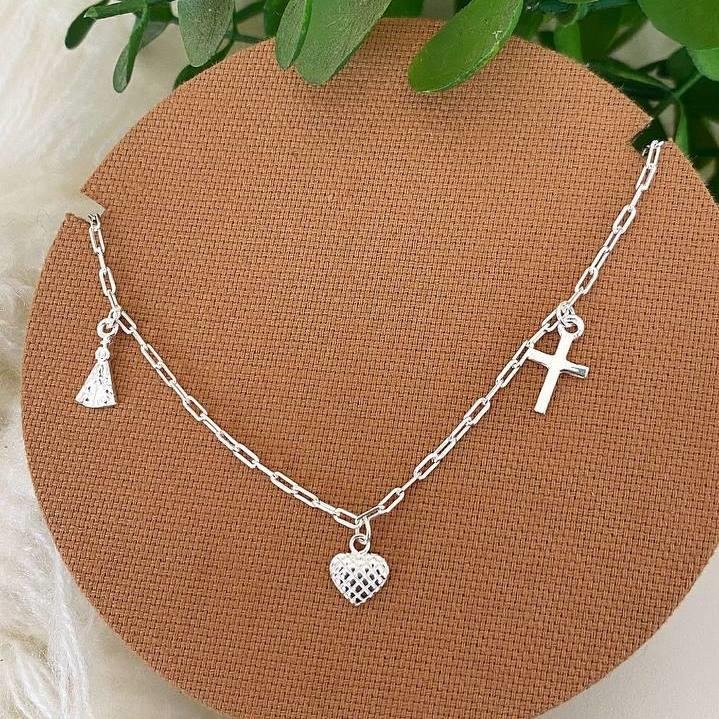 Tornozeleira Prata 925 Legitima. Elos retângulares com três penduricalhos, sendo eles : uma cruz, um coração trabalhado e uma imagem de Nossa Senhora. Fecho boia.Medidas: